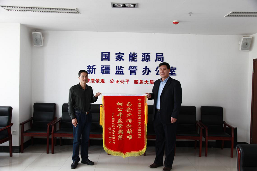 2月9日上午,中广核额敏风力发电有限公司副总经理马保军将一面绣着“为企业排忧解难,树公平监管典范”的锦旗送到了国家能源局新疆监管办公室,以表达对我办稽查处在220千伏安泰变资产分摊及运维事宜中开展调解工作的感谢之情。
